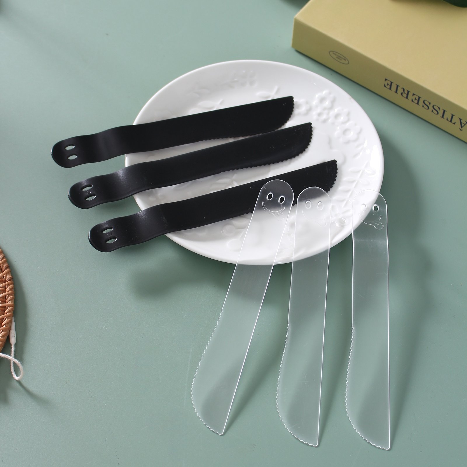 This disposable frosted knife features a cheerful smile-face design and a thick, reinforced structure that provides reliable cutting strength for cakes, pastries, fruits, and everyday meals. Each knife is individually wrapped to ensure cleanliness and convenience for takeout, bakery service, events, and catering. The matte texture offers a comfortable grip and prevents slipping during use. Practical, hygienic, and visually appealing, it is an excellent choice for dessert shops, restaurants, parties, and home gatherings.
