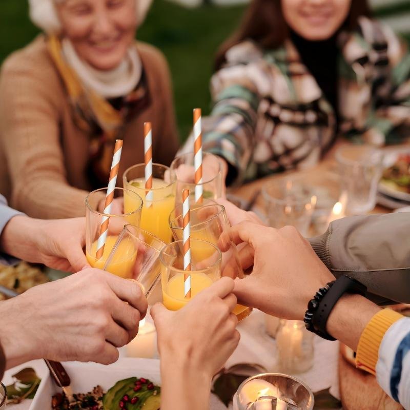 Disposable plastic straws with orange-white stripes, vibrant and suitable for juice, milk tea, and various cold drinks.