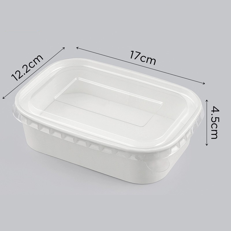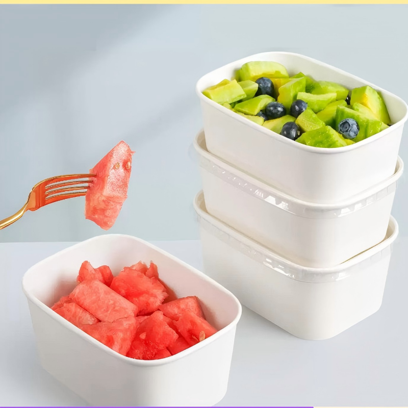 Crafted from food-grade white kraft paper, this rectangular container offers a clean, modern appearance that complements a wide range of food presentations. Its reinforced, moisture-resistant structure maintains shape even with juicy or heavier foods, ensuring reliable performance for fruit cuts, salads, desserts, light meals, and daily meal prep. The stackable design allows for efficient storage and transport, while the sturdy build ensures secure handling during dine-in service, takeaway, or delivery. Ideal for restaurants, cafés, salad bars, and home use, this container delivers a convenient, hygienic, and professional packaging experience. Made from eco-friendly materials, it supports sustainable practices and provides a high-quality solution for modern food packaging needs.